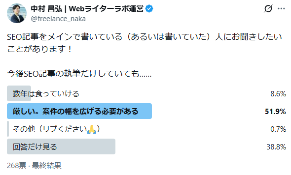 多くの企業がAIを導入し、構成案や文章のたたき台を作成するようになったため、SEOライティングの案件数は減っているのです。